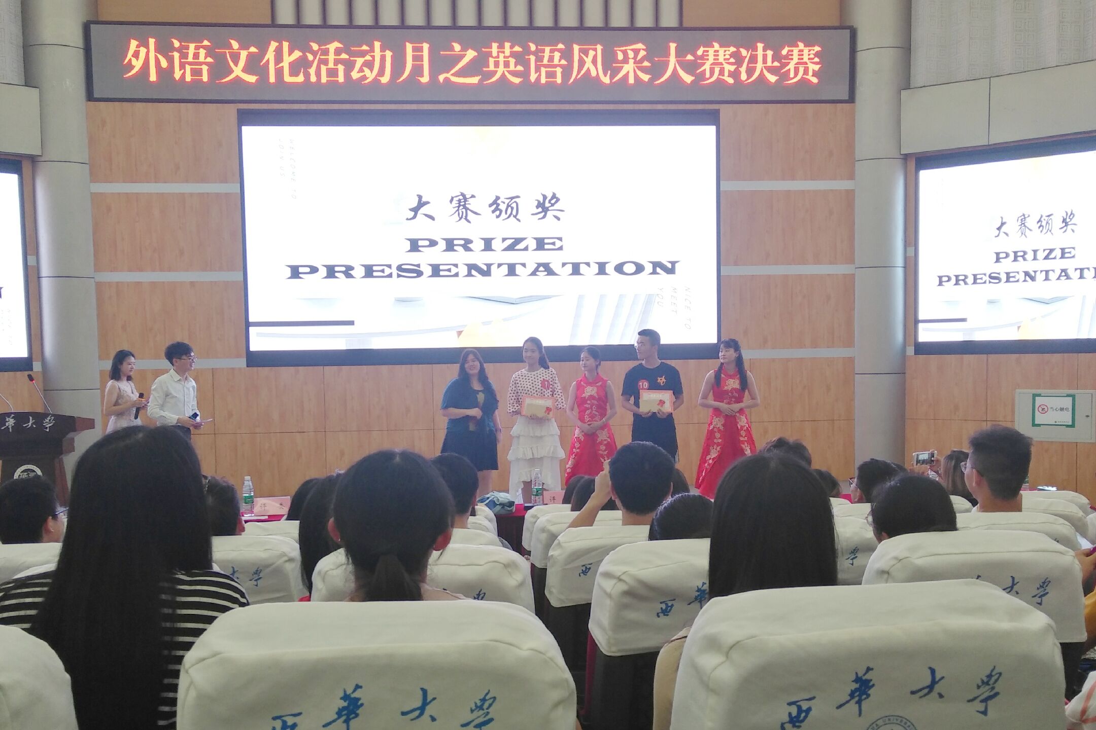 以“Youth in the Era”为主题的英语风采大赛于5月15日晚在四教报告厅落下帷幕,同时也为本次外语文化活动月画上了一个圆满的句号。本次决赛分为两轮,第一轮是“命题演讲”,第二轮由“演员的诞生”和“我是小小推销员”两部分组成。选手们语言自然流畅,发音地道,向观众和评委老师展现了当代大学生的精神面貌和魅力风采。最终,3名同学获得三等奖,2名同学获得二等奖,1名同学荣膺桂冠。