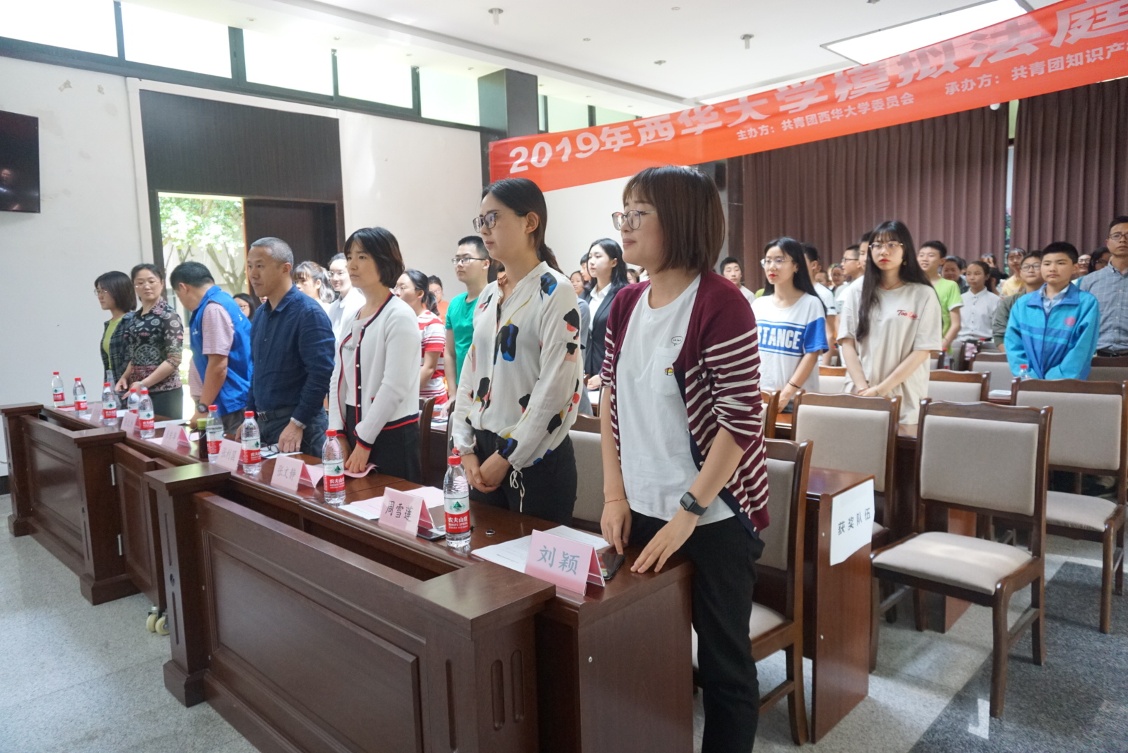 为提高大学生的法律实务能力和学习法律的兴趣,5月16日下午,由教务处、校团委主办,知识产权学院、法学院,西华大学启点·法学社共同承办的2019年西华大学模拟法庭竞赛决赛在模拟法庭(6A-136)正式拉开序幕。应邀参与本次比赛的有教务处副处长刘克剑、四川果然律师事务所主任田金陇、校团委老师周雪莲、院党委副书记兼副院长肖东华、副院长冯永泰、郫都区红光镇司法所所长胥文杰、院长助理张利国、知识产权系主任吉方英、学工办主任张文静和团委书记刘颖。此外,参与本次比赛的还有红光中学的师生代表50余人。