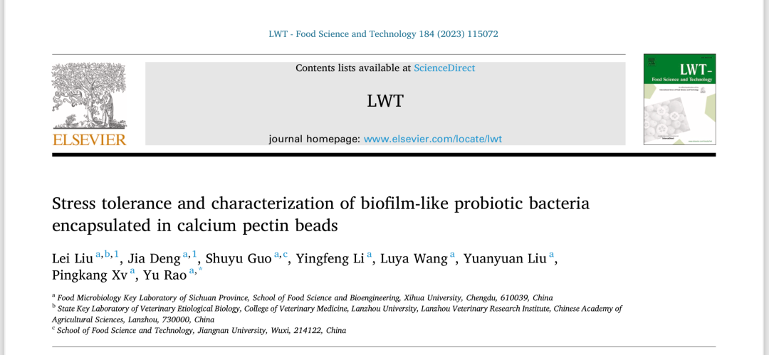近期,我校食品与生物工程学院饶瑜教授和兰州大学动物医学与生物安全学院刘蕾研究员合作在国际食品TOP期刊LWT - Food science and technology (Q1,IF:6.0) 发表题为 “Stress tolerance and characterization of biofilm-like probiotic bacteria encapsulated in calcium pectin beads”的研究性论文,兰州大学动物医学与生物安全学院刘蕾研究员和西华大学研究生邓佳为共同第一作者,通讯作者为西华大学食品与生物工程学院饶瑜教授。