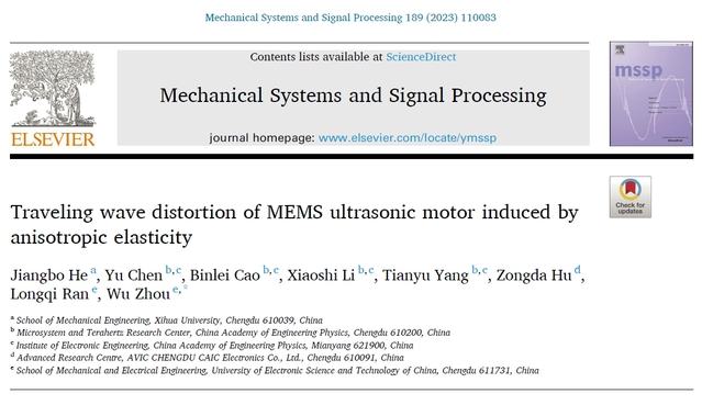 近期,机械工程学院装备智能设计与方法科研团队何江波副教授在国际知名期刊《MECHANICAL SYSTEMS AND SIGNAL PROCESSING》发表题为“Traveling wave distortion of MEMS ultrasonic motor induced by anisotropic elasticity”的研究论文。何江波副教授为论文的第一作者,西华大学为论文的第一完成单位,合作单位包括电子科技大学和中国工程物理研究院微系统与太赫兹研究中心。