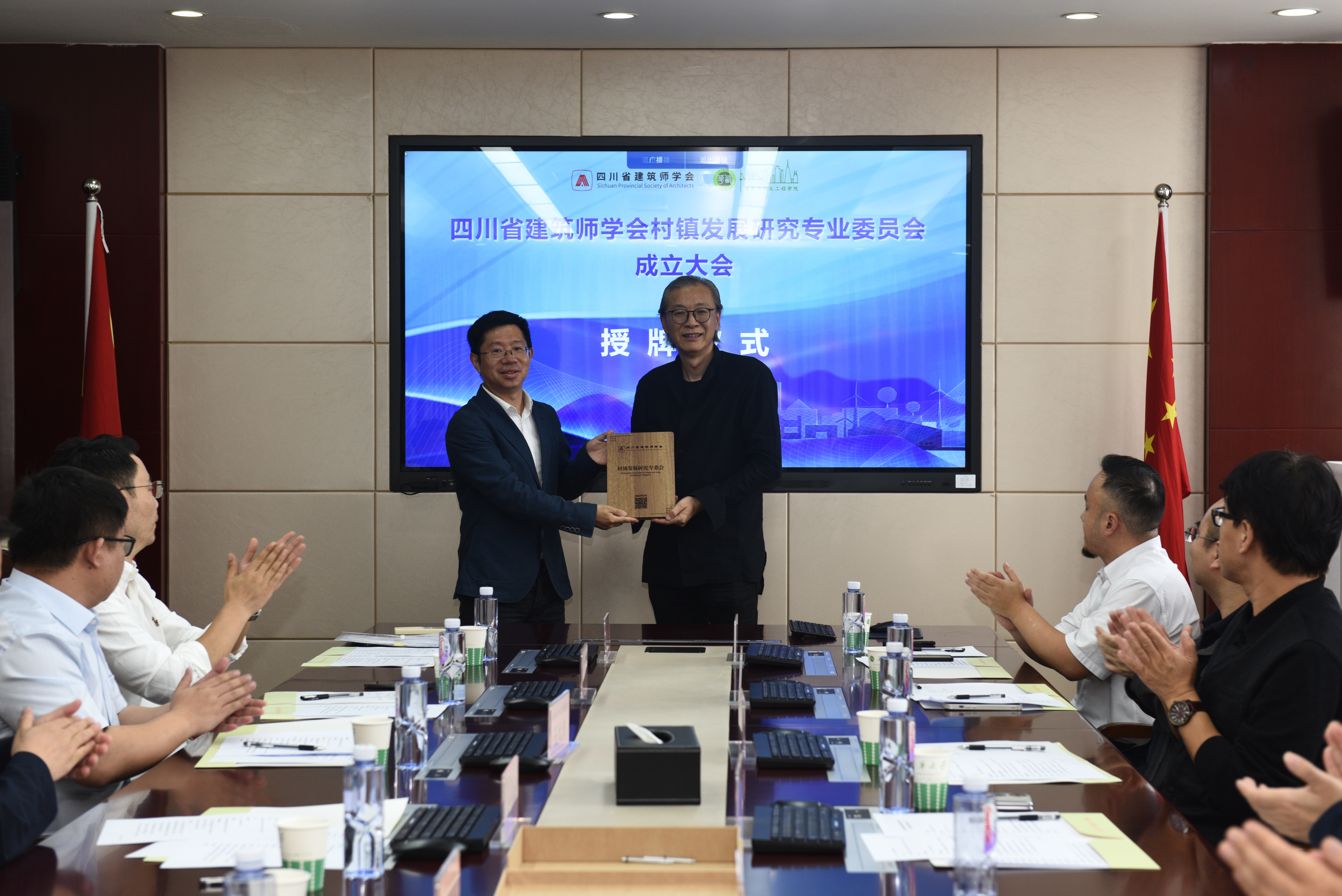陈荣锋宣读了四川省建筑师学会对村镇发展研究专业委员会成立的批复,钱方向专委会主任委员舒波进行了授牌。专委会依托西华大学建筑与土木工程学院,目前涵盖了川内5所高校以及6家知名设计机构,11名委员。专委会主任委员由西华大学建筑与土木工程学院院长舒波教授担任。