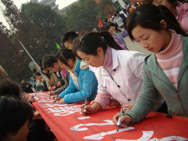 12月9日,数学与计算机学院在明德广场举行纪念“一二·九”历史图片展及签名活动。此次活动由数学与计算机学院09级软件工程专业主办。 很多同学在参观图片后,都踊跃在印有“传承12·9精神,撰写历史新篇章”的横幅上签名并抒发爱国情怀。同学们表示:作为祖国的栋梁,国家越是到了危难的时候,我们就是要越发的发扬我们的爱国精神,这正是“12.9”运动的精神所在,我们所要做的就是不断的发扬爱国精神,在12.9精神的激励下努力学习,报效祖国,让祖国的明天更加繁荣。 1935年的12月9号,北平市学生联合会率领北平市6000多名学生举行示威游行。学生们高呼打倒日本帝国主义,停止内战,一致对外。后来示威游行的队伍不断扩大。国民党政府出动了大批的军警进行镇压,很多大学生为了祖国付出了宝贵的生命。