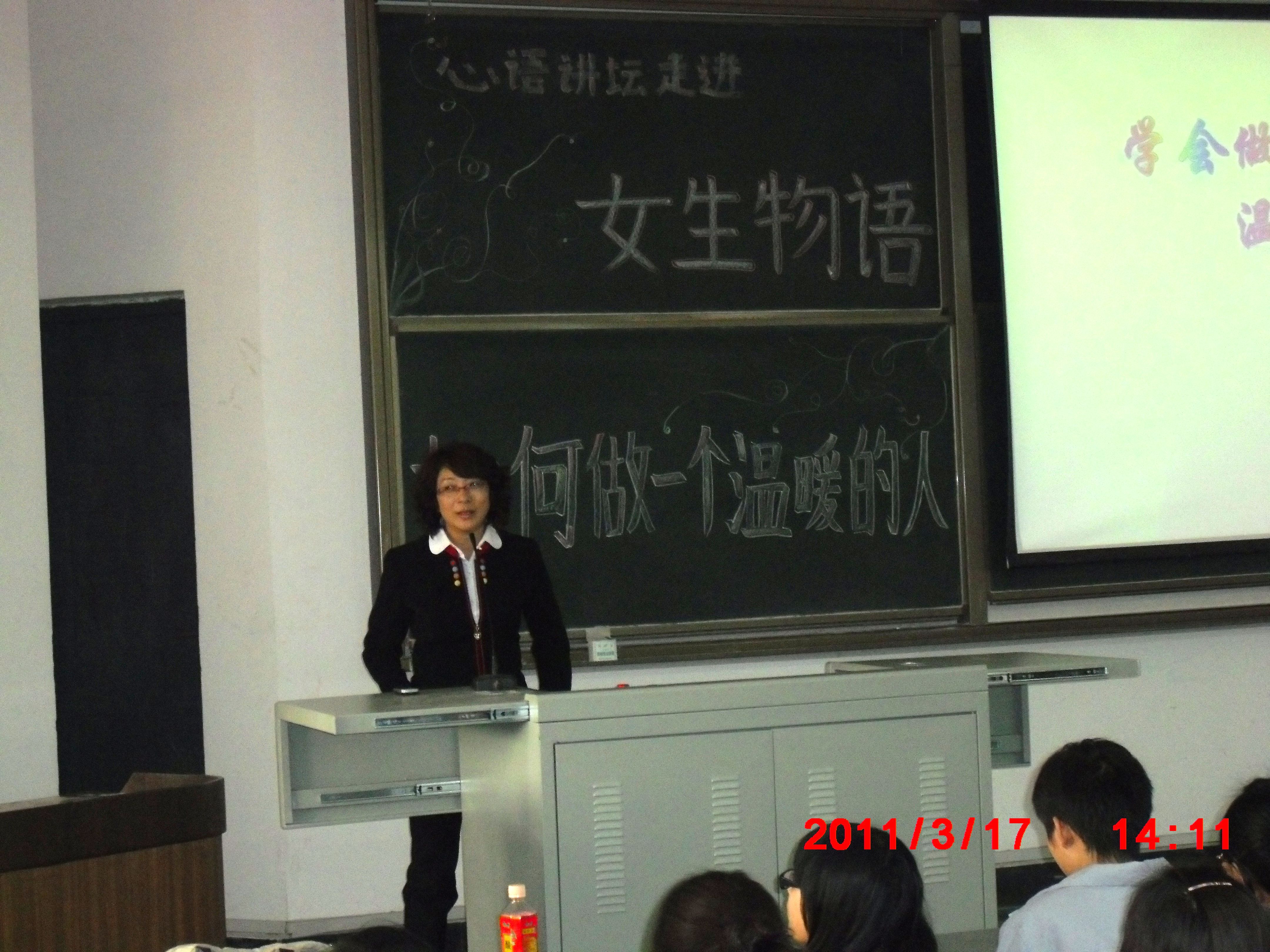 3月17日下午两点,“女生物语”系列活动之女生专题讲座在6B—304举行。主办方邀请到了学校心理咨询中心副主任吴薇莉教授为同学们作了题为“如何做一个温暖的人”的讲座,吴教授用阳光般的微笑,穿透和温暖了每一位学生的心灵,为“女生物语”系列活动增加了一抹亮色。 “女生物语 ”系列活动是由校学生会主办的,以女生为活动对象的活动,目的是让人们关注女生,也让女生关爱自己,让女生能更好的成长。系列活动主要包括“爱心T恤”DIY活动、走进女生心理讲座“如何做一个温暖的人”、“旋转的水晶鞋”主题舞会和“印象女生”照片展等等。
