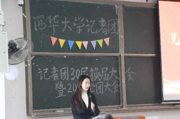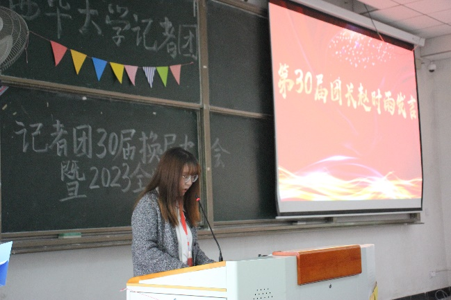 接着,第三十届记者团团长赵时雨上台发言。她表达了对新成员的欢迎,肯定了记者团成员们面对困难与挑战,始终坚持奋斗,出色完成工作的精神品质。她表达了对记者团的期望,希望通过学生记者的视角展现西华大学的新闻动态,也希望记者团成员们永怀最初的热爱,把握住平台与机遇,获得更多的成长与进步。