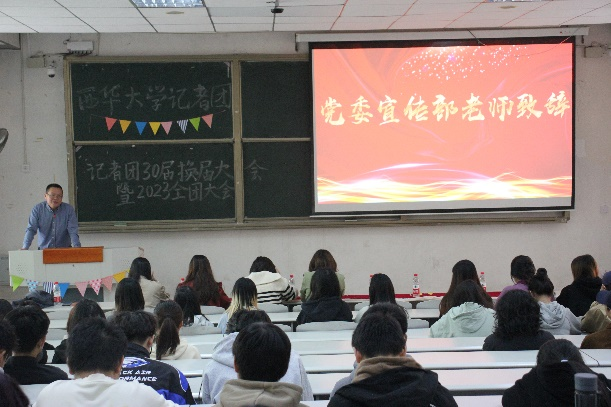 党委宣传部副部长翟元平致辞,他提出了三个关键词——“祝贺”“感谢”“希望”,以此表达对记者团成员们的殷殷期许。“第一是祝贺,祝贺记者团成立三十周年,祝贺新成员们做出了加入记者团的重要选择;第二是感谢,感谢党委宣传部各位老师以及第二十九届成员的辛苦付出与巨大贡献;第三是希望,希望每一位成员都能够牢记加入记者团的初心。”最后,翟元平以三个精——“精心”“精细”“精品”激励记者团成员始终做到志存高远,脚踏实地,为学校宣传工作贡献力量。