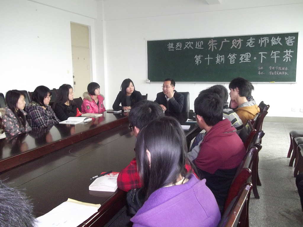 3月30日下午16:00,由管理学院团委主办,学生党员服务队承办的第十期“管理•下午茶”活动在学院会议室举行。 本次活动特邀管理学院朱广财老师为嘉宾。朱广财老师用幽默平实的语言给在场师生讲述了他的考研的经历,并以兴趣爱好与就业为主题,结合社会实际进行了详细剖析,告诉每位同学要认真学好专业知识,培养和发展自己的兴趣爱好。面对同学们对将来就业与发展的问题,朱老师以亲身经历告诫同学们要珍惜大学的学习时光,根据自己的兴趣爱好与专业知识选择适合自己的发展道路。朱老师实实在在的言语深深打动了在场师生,赢得了热烈的掌声。 最后,同学们和朱老师合影留念,此次活动在欢快的掌声中结束。