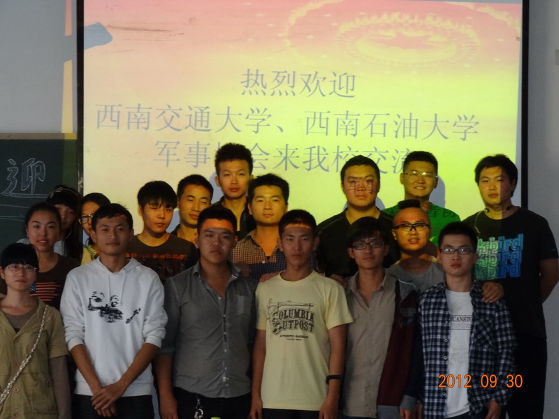 9月30日下午2:30,西南交通大学国防教育协会,西南石油大学国防军事协会和西华大学军事爱好者协会的交流合作会议在5B309召开。三校协会会长及相关负责人参加了此次会议。会议由军事爱好者协会会长苏炳旭主持。 首先,苏炳旭代表三校军事协会对以往的合作经验作了总结,并对以后的合作前景作了分析和展望。会上,三校协会会长依次展示了各自的合作策划,并主要就军事对抗赛和日后的合作项目进行研究分析,针对出现的相关问题也作了深层次的探讨。 经过三校军事协会成员的讨论和总结,最后达成共识,并共同为以后的合作和友谊而努力。