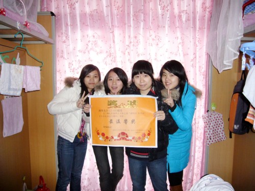 12月16日中午,管理学院分团委学生会生活部成员们来到本院学生所在的宿舍区,为在刚刚落下帷幕的第七届美寝大赛中获奖的各寝室颁奖。