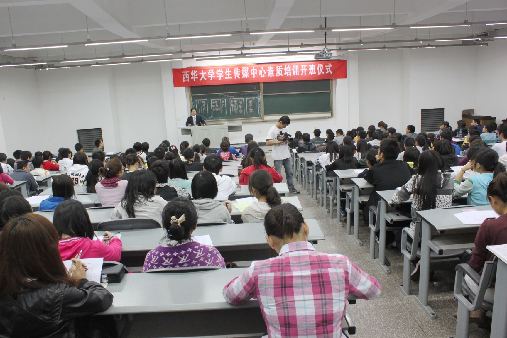 10月22日晚7:00,校党委宣传部学生传媒中心素质培训开班仪式在6B-108举行,拉开了校党委宣传部下属五大社团素质培训的序幕。西华社、广播台、西华新闻网、电视台、映像广角社五大学生传媒中心的两百余名新成员参加了培训开班仪式。