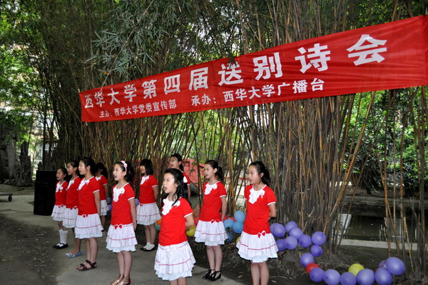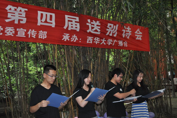 又是一年离别季。6月2日下午17:40,由西华大学党委宣传部主办、西华广播承办的第四届送别诗会在楠苑竹林浪漫开场。党委宣传部副部长陈召平及部分老师应邀出席诗会,来自全校各学院、各社团的同学都热情的参与了这场温馨的诗会。 “长亭外,古道边,芳草碧连天。”一首由西华附小的小朋友演唱的《送别》拉开了诗会的帷幕。西华广播的新老成员为大家带来了一首首精彩的诗歌朗诵;党委宣传部陈召平、王蜀苏、张安林三位老师合诵的《赠别》、离退休老师陈士力朗诵的《老师的心声》,充分表达了老师对同学们临别之际的不舍与祝福,陈士力老师更是脱稿朗诵,流露的真情感动全场。期间,也有不少热心观众为大家即兴朗诵;更有同学路过诗会现场,被现场浓厚的氛围感染,即兴为即将告别母校的同学赋诗一首,并现场请工作人员朗诵。一首又一首诗歌回荡在楠苑,无论是老师还是同学,他们都满怀激情,用每一个词语,每一个句子表达对大四毕业生的深深祝福。 本次诗会较以往相比更是新意多多。长长地走廊上,摆上“笔、墨、纸、砚”,挂满了一条条写有祝福的红纸条,温馨而意义深远;会场四周还有精美的书画作衬,人文学院徐攀老师更是为诗会题词,赠送墨宝“送别诗会”四字,为诗会增添了文化传统气息。 最后,一首《再见》道出了对毕业生的珍重和祝福。本届诗会伴着悠远的音乐圆满落幕。