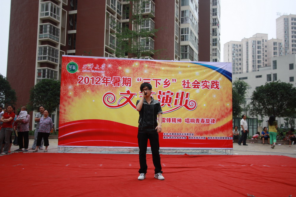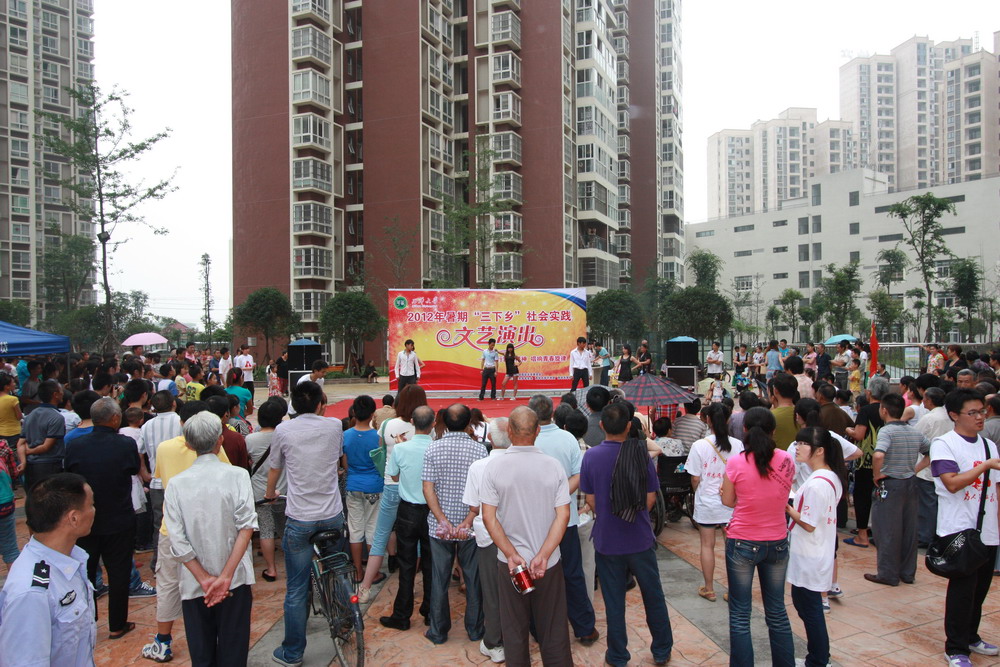 为丰富我校周边社区文化生活,增强我校同学社会实践能力,践行雷锋精神,6月28日,我校2012暑期“三下乡”雷锋志愿服务团走进红光镇新城佳苑社区,为社区居民带来了一场精彩纷呈的文艺演出。 文艺演出于下午3:00正式开始,我校志愿者精心准备的文艺表演吸引了众多社区居民驻足观看。充满青春气息的爵士舞蹈首先亮相,为本次文艺演出预热,随后展示在大家面前的歌曲串烧、古筝表演、二胡表演、双节棍表演等节目同样也精彩绝伦,引来了社区群众的连连称赞。最后,动感活力的啦啦操表演更是将本次文艺演出推向了高潮,同时也为此次演出画上了圆满的句号。 本次“三下乡”社会实践文艺演出作为“文化下乡”的重要项目,充分贯彻今年全国暑期“三下乡”社会实践“践行雷锋精神,唱响青春旋律”的主题,通过高校文化走进社区,我校为社区群众提供丰富多彩的志愿服务。据悉,我校暑期“三下乡”雷锋志愿服务团还将在该社区陆续开展一系列的社区服务。