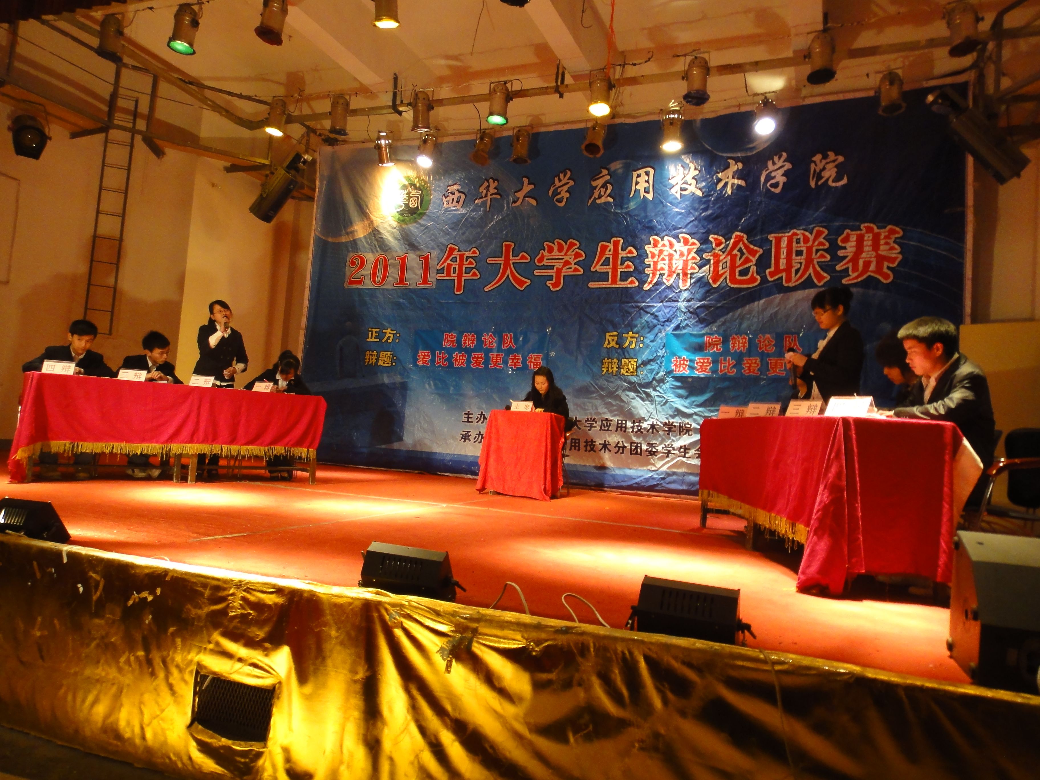 | 3月24日晚9时,应用技术学院2011年大学生辩论联赛在音乐厅正式拉开帷幕,学院团委书记赵必鸣、部分老师和同学近300人观看了揭幕赛。 揭幕赛的论题是“爱与被爱谁更幸福”,来自学院的正方、反方两队针对这一论题进行辩论。比赛分为论题陈述、攻辩、攻辩小结、自由辩论、总结陈词等五个环节。场上选手的妙语连珠和机智幽默为同学们奉献了一场精彩绝妙的比赛,引起了场下观众的阵阵喝彩。赵必鸣老师说,本次比赛旨在培养学院同学的人文素质和思辨能力,营造良好的校园文化氛围。学院对辩论联赛给予了高度重视,为同学们提供展示自我才能的机会,希望更多的同学参与比赛,并在比赛中得到锻炼与提升。