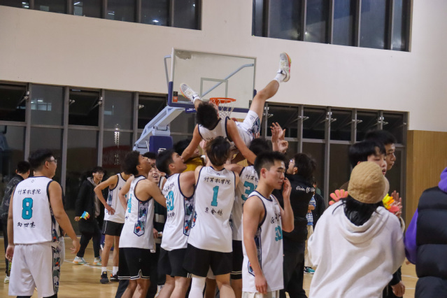 青春点亮梦想,激情燃动赛场。随着一声哨响,裁判员将球高高抛起,双方争球队员一同向上一跃,精彩的争夺战正式拉开帷幕。双方球员配合默契,攻防有序,展开你追我赶的激烈角逐,比分一直僵持不下。每当比分追平,便会引来全场观众热情欢呼。比赛接近尾声,材料学院队以2分的优势暂时领先。在比赛的最后14秒,计算机学院队6号选手易伟突破层层防守通过一记漂亮的抛投扳平了比分,并在材料学院队选手发球时成功抢断,随后,计算机学院队23号选手张舜奇迅速捡起篮球,在最后4秒钟完成上篮,绝杀对手。伴随着比赛哨声的结束,计算机学院队以55:53的比分赢得了本场比赛,夺得了“西华杯”篮球联赛冠军。