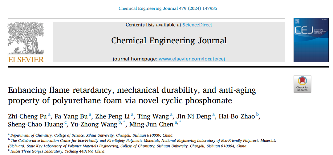 近日,理学院陈明军教授带领的功能高分子材料绿色制备与循环利用研究团队取得阻燃剂绿色合成与应用研究新进展。光催化连续流技术绿色合成阻燃剂的研究工作,发表在化学领域主流刊物Organic Chemistry Frontiers (中科院1区TOP,IF: 5.4)上,且被评为当期封面文章进行亮点介绍,该工作第一作者为理学院符志成博士,通讯作者为陈明军教授,得到了重庆邮电大学李经方老师和北京化工大学杨占会老师的指导;铜离子掺杂膨胀阻燃抑烟环氧树脂的研究工作发表在材料科学领域主流刊物Composites Part B-Engineering (中科院1区TOP,IF: 13.1)上,并入选ESI高被引论文 (见图2), 该工作第一作者为理学院2019级硕士研究生何磊,通讯作者为汪婷副教授和陈明军教授;与四川大学王玉忠院士合作完成的新型环状磷酸酯高阻燃聚氨酯的研究工作,发表在化工领域顶级刊物Chemical Engineering Journal (中科院1区TOP,IF: 15.1)上,该工作的第一作者为理学院符志成博士,通讯作者为王玉忠院士和陈明军教授 (见图3)。