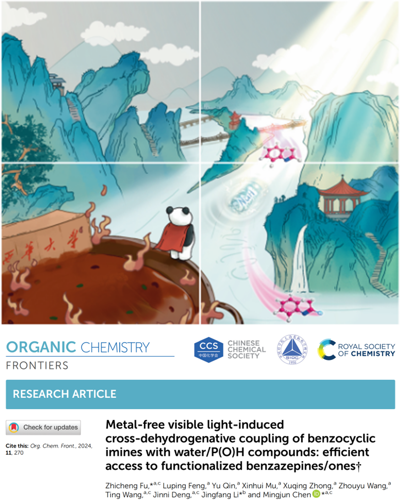 封面亮点介绍论文(Organic Chemistry Frontiers, 2024, 11, 270-276),封面以世界水利工程文化遗产都江堰和西华大学为背景,将化学与自然之美融为一体,同时融合了世界上最受欢迎的大熊猫和成都的标志性火锅等元素,利用阳光和河流的相互作用来展示光催化连续流化学技术的神奇力量。随着河流的流动,它们象征着这项技术对我们未来生活的无限潜力。
