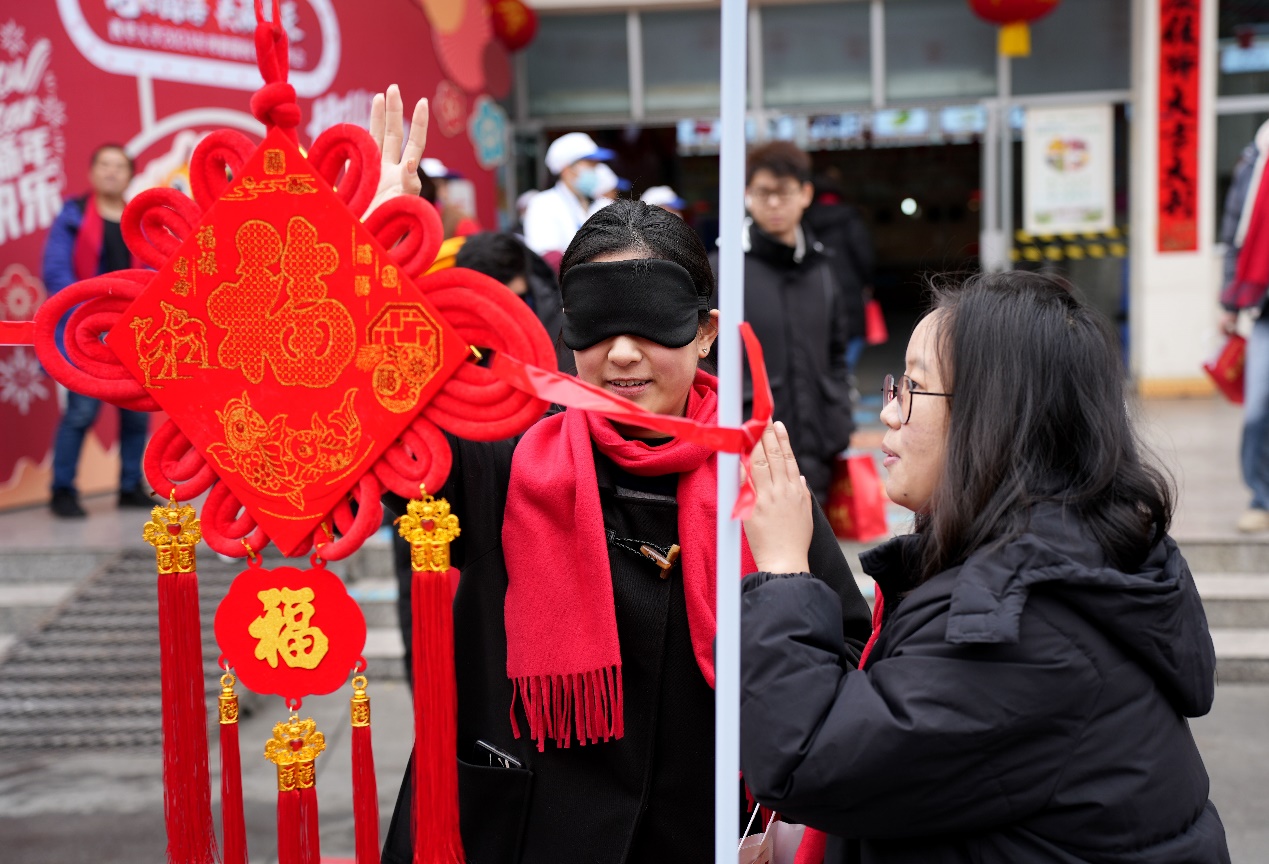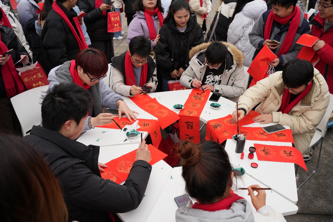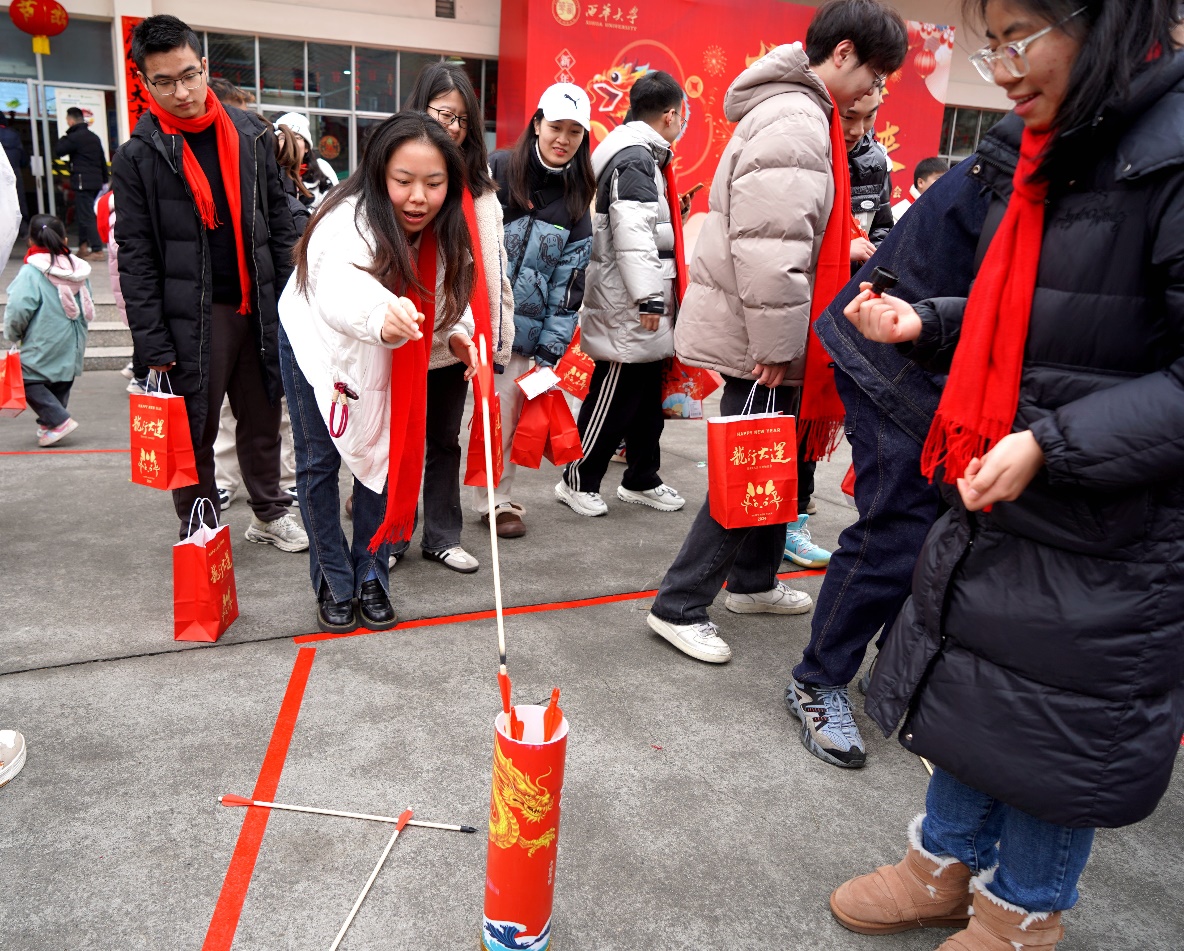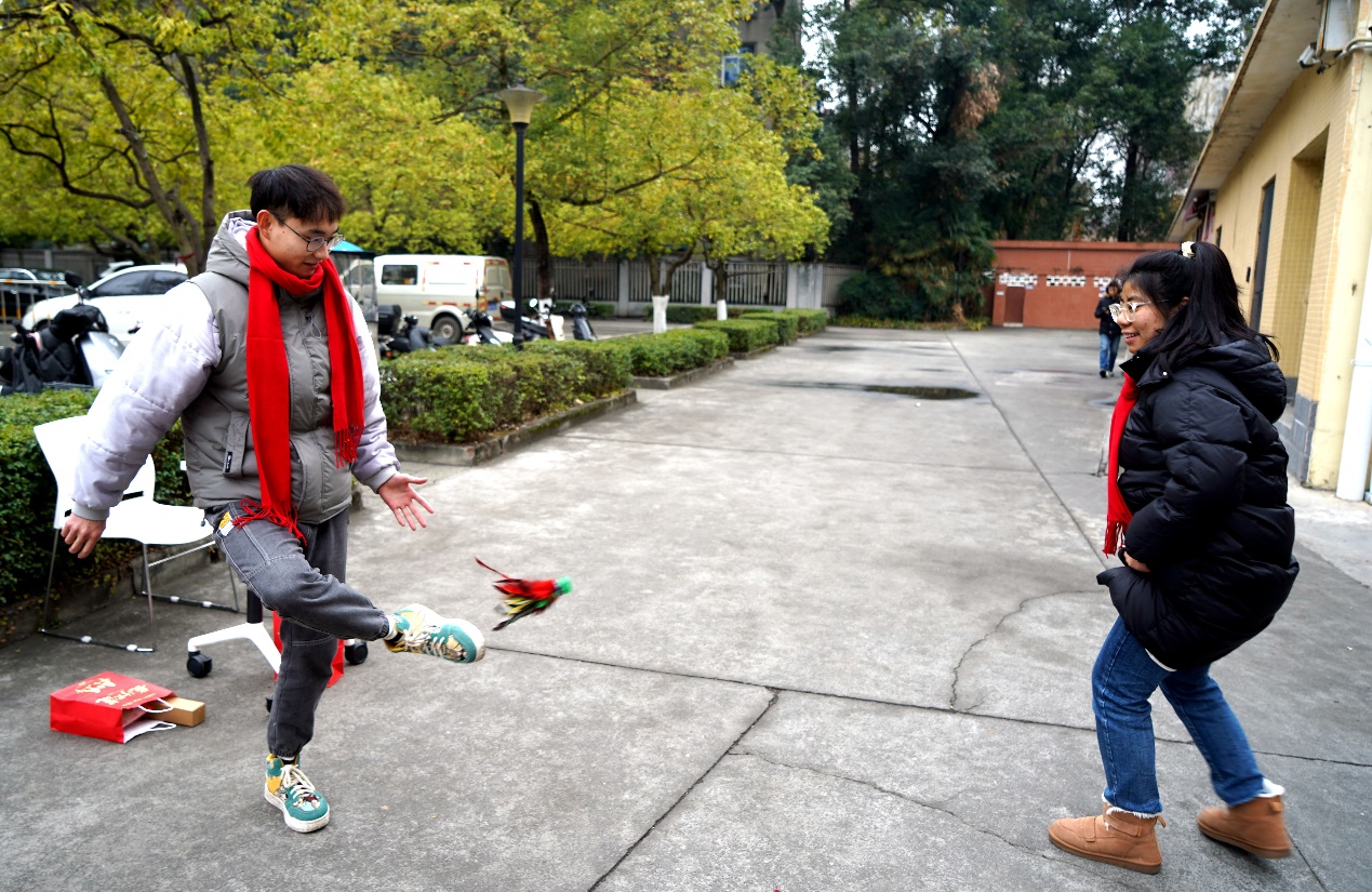 现场还举行了丰富多彩的游园活动,活动包含挥毫泼墨写春联、蒙眼摸福、好运投壶、金锣迎新、抖甩乒乓球、对战弹弹棋、踢毽子、福卡盲盒等项目。现场充满欢声笑语,同学们积极参与,在游戏中感受年味,在欢笑中迎接新年。