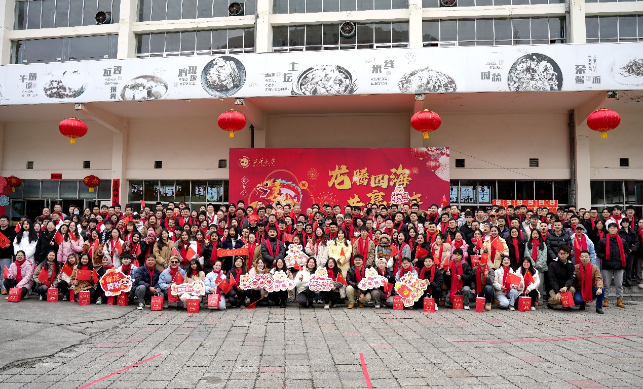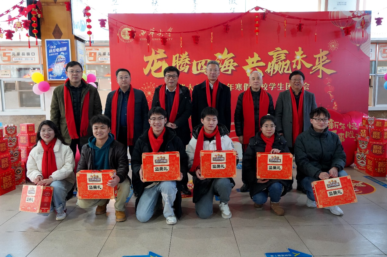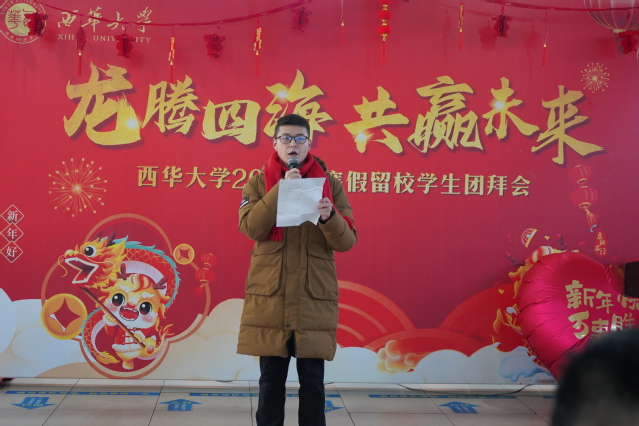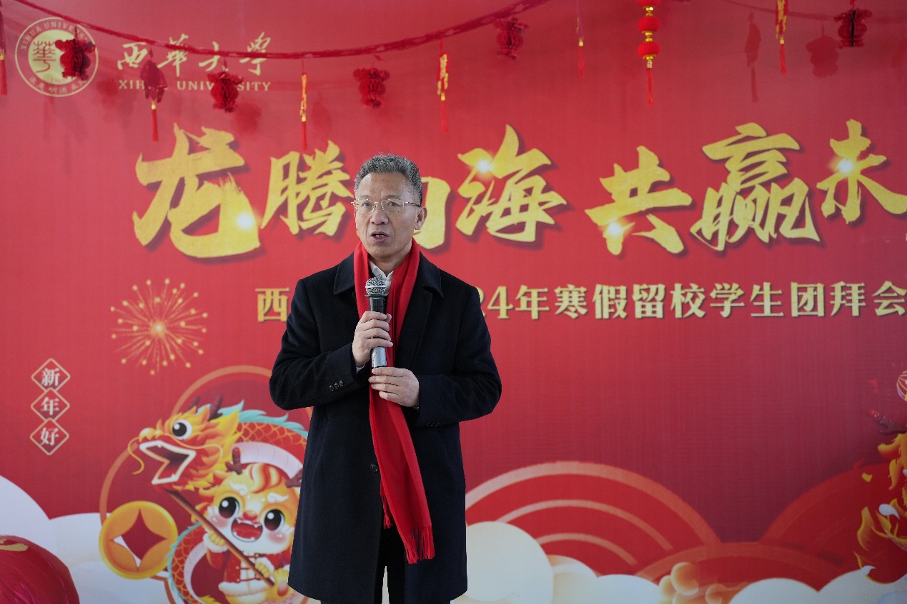 玉兔辞旧,龙腾贺新。2月6日上午,西华大学学生一食堂内外张灯结彩,喜气洋洋,“龙腾虎跃,共赢未来”西华大学2024年寒假留校学生团拜会在热闹祥和喜庆的氛围中举行。校党委书记刘树根,党委副书记张力,副校长刘小兵、郎方年、邵永波,学校相关职能部门负责人、关工委及各学院分管学生工作主要负责人及200余名留校学生欢聚一堂,畅叙收获、共迎新春。团拜会由党委学生工作部副部长陈雁主持。
