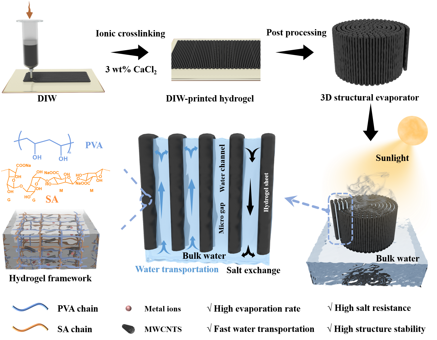 清洁的水资源对人类社会的发展极为关键。全球近30亿人生活在严重缺水地区,海水淡化和污水净化是缓解水资源短缺的有效策略。然而,依赖热能或滤膜的传统海水淡化技术能耗较大,且需要大型且复杂的集中式基础设施。探索非常规水资源已经成为缓解淡水短缺的可行解决方案,其中太阳能蒸发是一种零能耗和环保的淡水获取方法。由于水凝胶独特的三维网络结构及成本较低、绿色可持续和优异的物理化学性能等优点,在太阳能蒸发器领域受到广泛的关注。