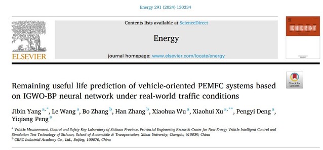“Remaining useful life prediction of vehicle-oriented PEMFC systems based on IGWO-BP neural network under real-world traffic conditions”(Energy)论文第一作者为团队成员杨继斌副教授,第二作者为2021级硕士研究生王乐。该论文提出一种改进的灰狼优化算法和BP神经网络相结合的方法,以相对功率损失率为健康指标,在实际交通条件下预测车载质子交换膜燃料电池系统的剩余使用寿命。