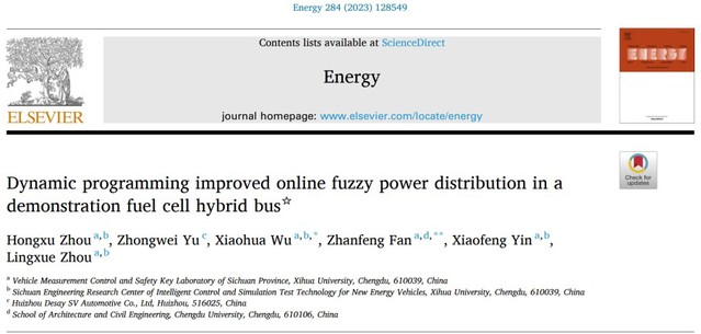 “Dynamic programming improved online fuzzy power distribution in a demonstration fuel cell hybrid bus”(Energy)论文第一作者为团队负责人武小花教授指导的2021级硕士研究生周鸿旭。该论文提出一种基于动态规划改进模糊控制规则的燃料电池混合动力公交车能量管理策略,该策略离线和硬件在环仿真验证结果同样支持优化燃料电池电动车辆实车在线能量调度。