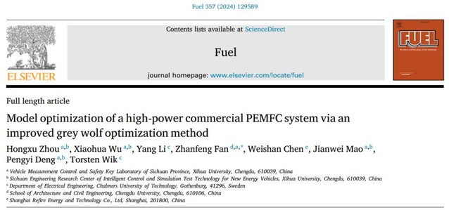 “Model optimization of a high-power commercial PEMFC system via an improved grey wolf optimization method”(Fuel),论文第一作者为团队负责人武小花教授指导的2021级硕士研究生周鸿旭。该论文提出了一种利用混沌理论和随机游走策略进行改进的灰狼优化算法,以优化燃料电池半经验模型参数。