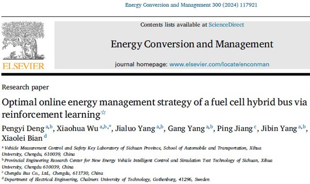 “Optimal online energy management strategy of a fuel cell hybrid bus via reinforcement learning”(Energy Conversion and Management)论文第一作者为团队成员邓鹏毅副教授,通讯作者为团队负责人武小花教授。该论文提出一种基于强化学习的燃料电池混合动力公交车多目标能量管理策略,用于优化燃料电池电动车辆实车在线能量调度。