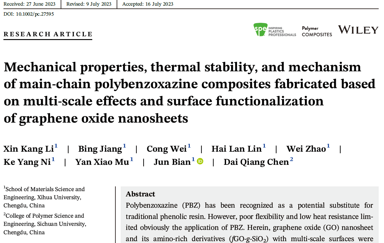 “Mechanical properties, thermal stability, and mechanism of main-chain polybenzoxazine composites fabricated based on multi-scale effects and surface functionalization of graphene oxide nanosheets”。