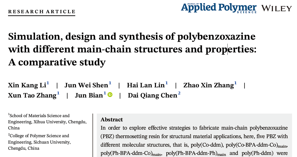 此前,本课题组已经在国际知名期刊Journal of Applied Polymer Science和Polymer Composites上发表了关于PBZ及其复合材料相关的研究性论文3篇,分别是“Simulation, design and synthesis of polybenzoxazine with different main-chain structures and properties: A comparative study”