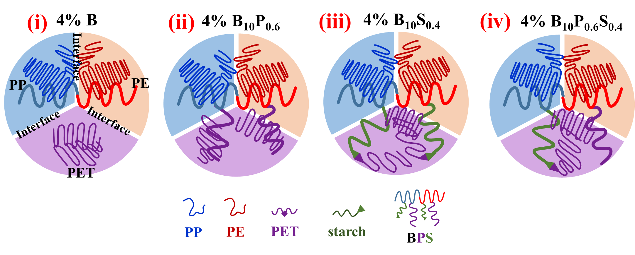 该文进一步揭示了该大分子增容剂的增容机理。若将BPS添加到熔融共混物中,它们将主要存在于塑料的界面中。BPS的PET链段可以与均聚物中的PET共结晶和纠缠。此外,淀粉链段可以与PET进行酯交换反应,生成starch-b-PET嵌段共聚物,从而增大与均聚物进行链缠结的可能性(图3)。