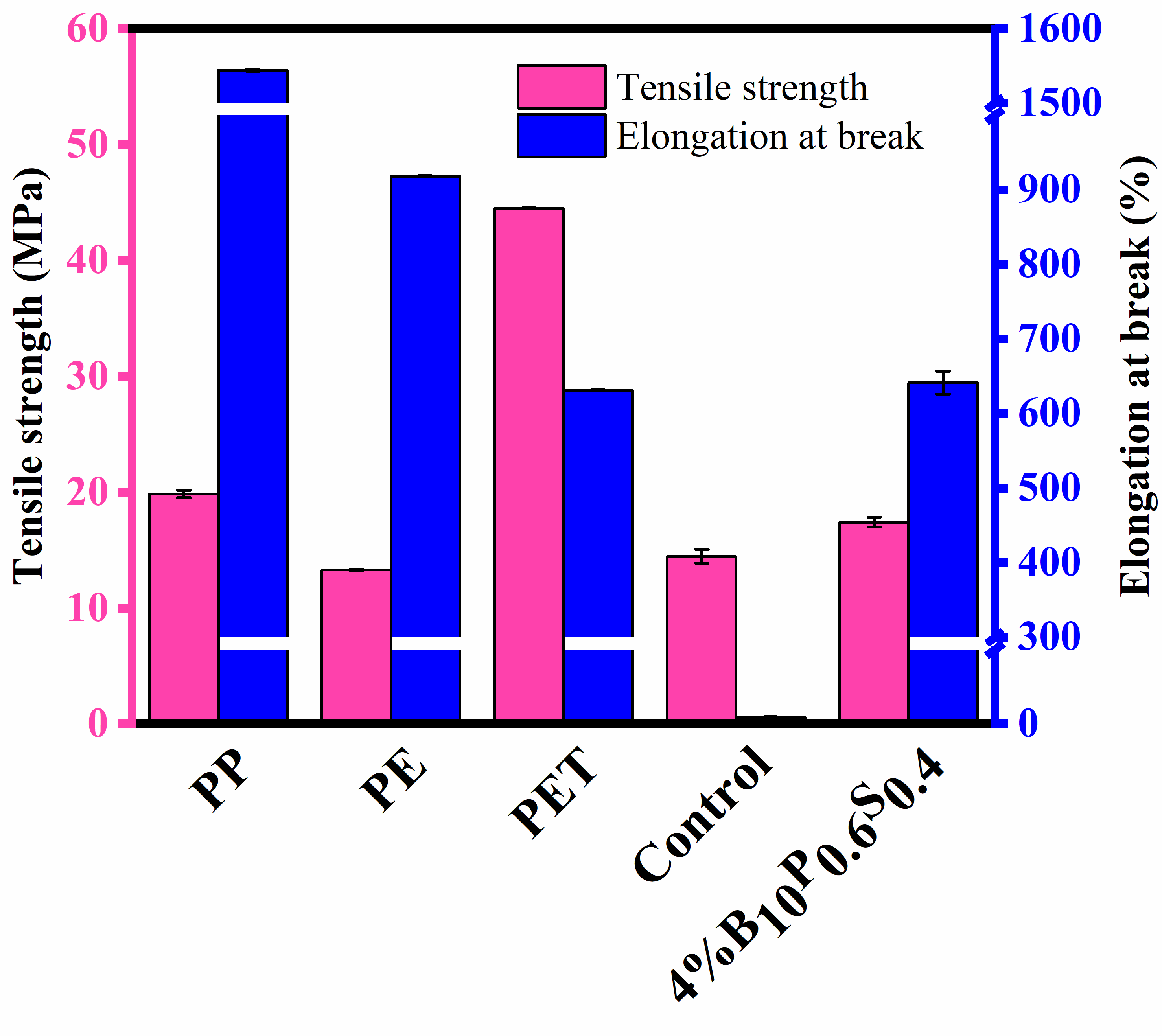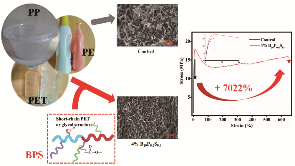 本文合成并使用了一种新型接枝共聚物(PP-b-PE)-g-PET, starch (BPS),作为PP/PE/PET三元共混塑料的增容剂,明显提升了混合塑料的力学表现(以断裂伸长率为代表,提升超过7000%,图1)。