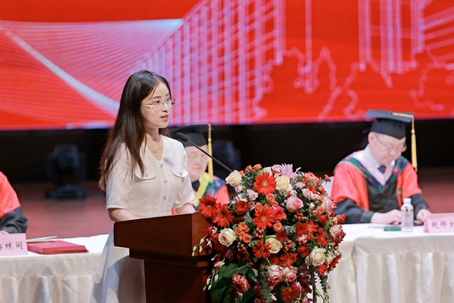 马克思主义学院教师江静作为教师代表发言。她希望同学们牢记西华校训,在新征程上努力践行:求是是治学之基,明德是立身之本,卓越是立业之要。她表示,今天暂时的离别是为了将来更好地相聚,希望同学们在强国建设、民族复兴的新征程上,有最远大的抱负、最出彩的青春,争做国之栋梁。