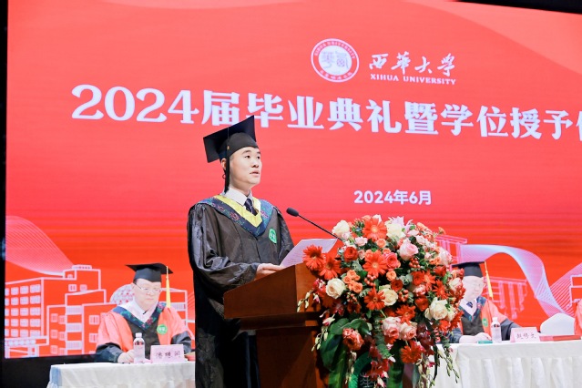 机械工程学院学生罗丕江作为本科生代表发言。他谈到,在西华学习这几年,学校教会了他努力向外看,学会向内求,坚定向前走。他号召全体毕业生,无论前往何方,身处何地,要牢记“求是、明德、卓越”的西华校训,牢记母校的殷切嘱托,带着西华人的责任担当,逐梦赴山海,扬帆再起航。