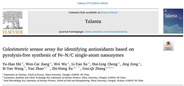 近日,理学院张国麒博士课题组在中科院SCI 1Talanta (IF5.6, TOP)发表题为“Colorimetric sensor array for identifying antioxidants based on pyrolysis-free synthesis of Fe-N/C single-atom nanozymes”2Analytica Chimica Acta (IF5.7, TOP)期刊发表题为“Non-pyrolytic synthesis of laccase-like iron based single-atom nanozymes for highly efficient dual-mode colorimetric and fluorescence detection of epinephrine”的研究性论文。第一作者为研究生石玉涵,通讯作者为张国麒博士,赵艳教授,徐志宏教授。