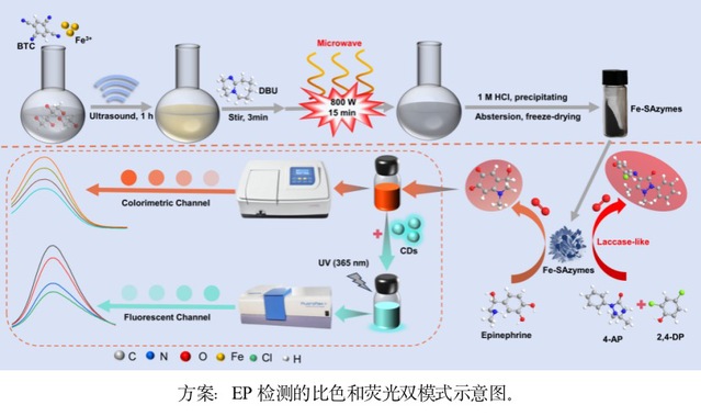 本文主要研究了微波辐照下非热解制备类漆酶铁基单原子纳米酶(Fe-SAzymes)。在低含量铁负载条件下,Fe-SAzymes的漆酶活性显著提高(12.1 U/mg),是天然漆酶活性的24倍。此外,Fe-SAzymes表现出对肾上腺素(EP)的有效催化氧化,使其能够进行比色检测。根据Fe-SAzymes高效的漆酶活性,将常规纳米酶检测EP的时间从60 min缩短至20 min,检出限低至2.95 μM。此外,结合碳点(CDs)探针,利用EP氧化产物和CDs的内滤光效应,建立了一种超灵敏的EP荧光检测方法。检测限进一步降低至0.39 μM
