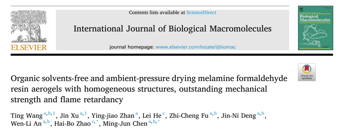 此外,创新地利用聚合物原位聚合三聚氰胺甲醛树脂的方法,成功实现兼具强度和韧性的三聚氰胺甲醛树脂的合成,实现无溶剂置换的常压干燥法制备高强度本征阻燃的三聚氰胺甲醛树脂气凝胶材料。其成果发表在材料科学领域主流刊物International Journal of Biological Macromolecules (中科院1区TOP,IF: 7.7),第一作者为理学院汪婷副教授和理学院2024届化学与生物医药硕士徐津,通讯作者为四川大学赵海波教授和陈明军教授,西华大学为第一单位 。