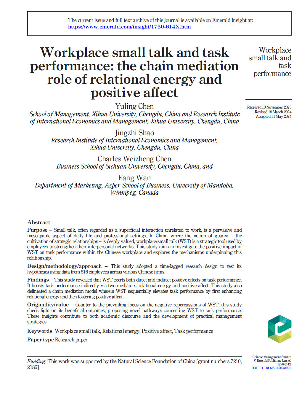 国际经济与管理研究院2022级工商管理专业硕士研究生邵婧芝主笔的文章在国际期刊《Chinese Management Studies》(SSCI)发表,题为“Workplace small talk and task performance: the chain mediation role of relational energy and positive affect”。陈玉玲副教授为论文的第一作者,硕士研究生邵婧芝为第二作者兼通讯作者,西华大学为论文的第一完成单位。该研究工作为国家自然科学基金青年基金项目(72102186)的阶段性成果之一。