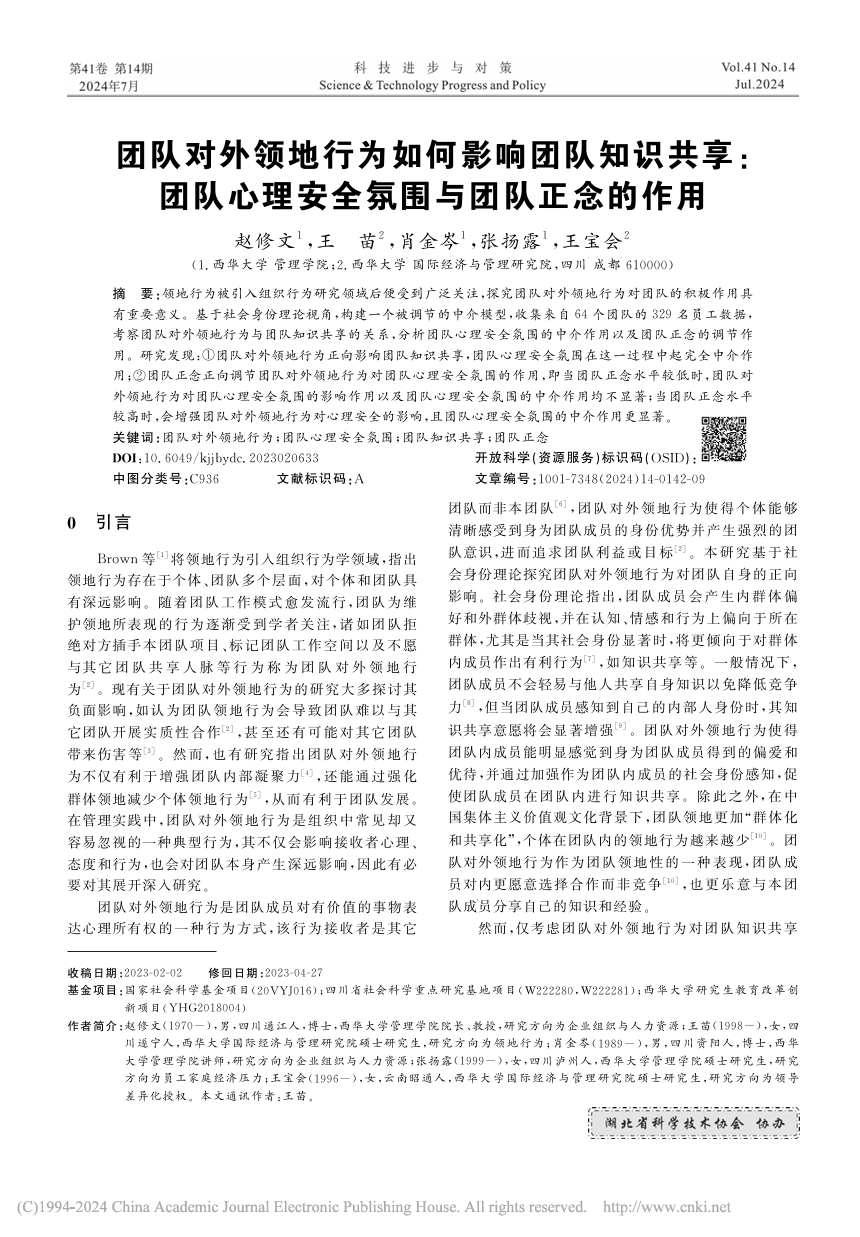 国际经济与管理研究院2021级工商管理专业硕士研究生王苗主笔的文章在CSSCI收录期刊《科技进步与对策》发表,题为“团队对外领地行为如何影响团队知识共享:团队心理安全氛围与团队正念的作用”。赵修文教授为论文的第一作者,硕士研究生王苗为论文的第二作者兼通讯作者,西华大学为论文的第一完成单位。该研究工作为四川省社会科学重点研究基地项目(W222280,W222281)的阶段性成果之一。