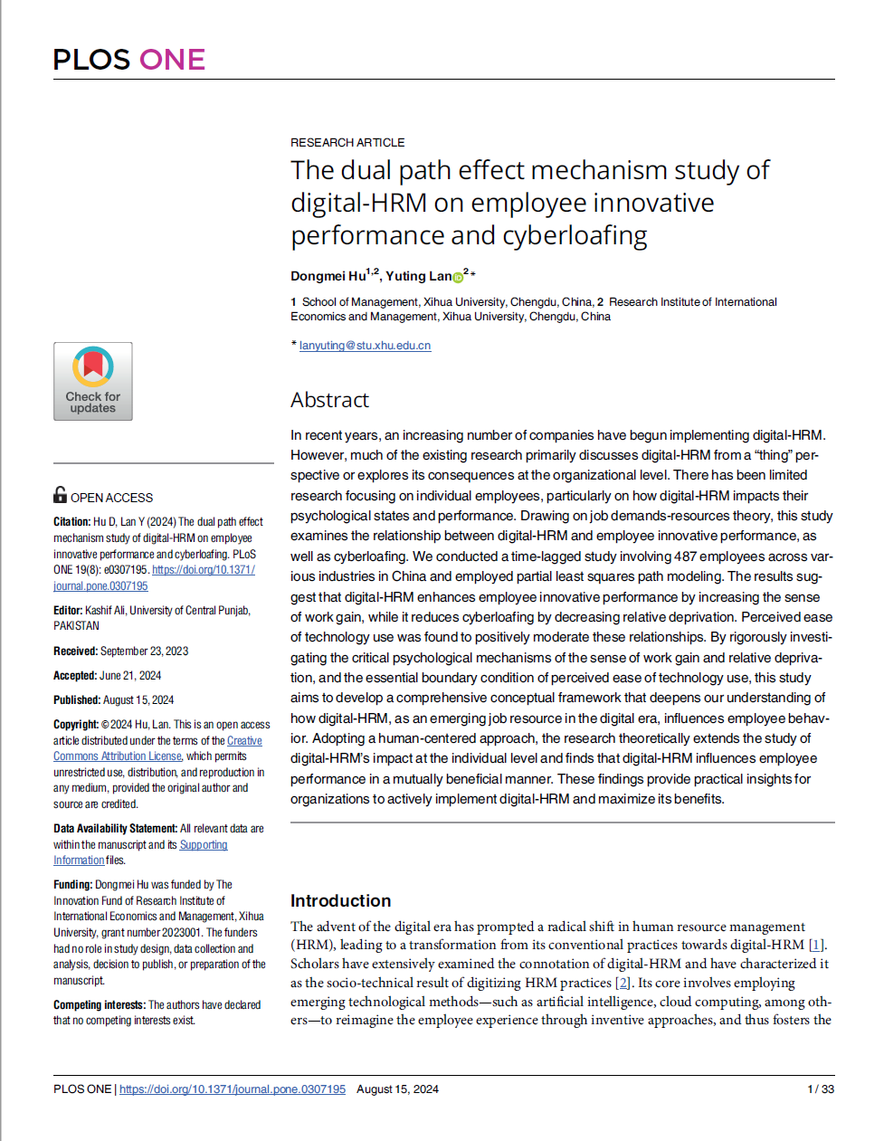 国际经济与管理研究院2022级工商管理专业硕士研究生蓝雨婷主笔的文章在国际期刊《PLOS ONE》(JCR一区)发表,题为“The dual path effect mechanism study of digital-HRM on employee innovative performance and cyberloafing”。胡冬梅教授为论文的第一作者,硕士生蓝雨婷为论文的第二作者兼通讯作者,西华大学为论文的第一完成单位。
