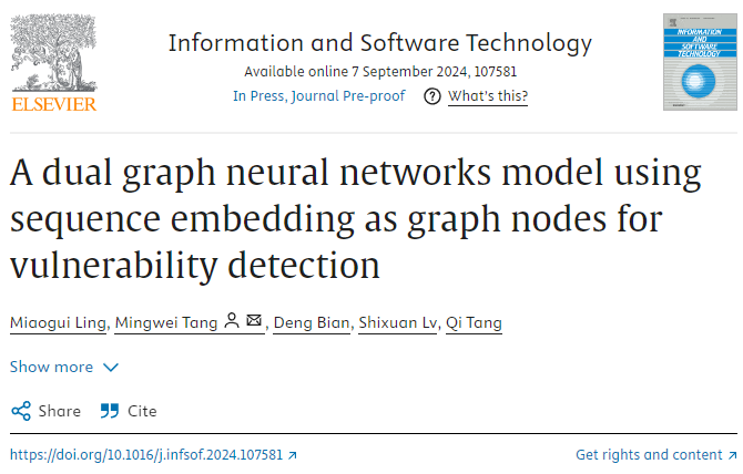 论文6A Dual Graph Neural Networks Model using Sequence Embedding as Graph Nodes for Vulnerability Detection的研究论文在国际顶级学术期刊INFORMATION AND SOFTWARE TECHNOLOGY上发表论文第一作者为研究生凌苗桂,通讯作者为唐明伟教授。