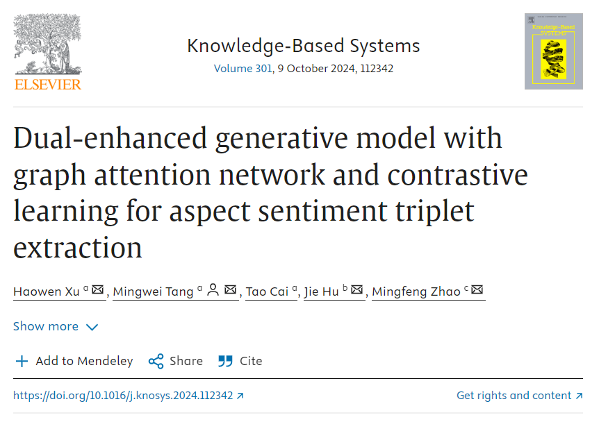 论文2Dual-enhanced Generative Model with Graph Attention Network and Contrastive Learning for Aspect Sentiment Triplet Extraction,由唐明伟教授担任通讯作者,第一作者2022级研究生徐皓文已被国际顶级学术期刊《Knowledge-Based Systems》接受并在线发表。
