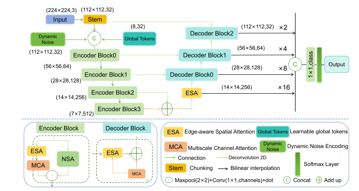 本文提出了集成噪声自适应注意力神经网络INA-Net创新性地引入了轻量级的噪声-距离注意模块,有效结合局部和模拟噪声特征与全局信息,提高了对复杂混合噪声的鲁棒性。同时,边缘感知空间注意力(ESA)和多尺度通道注意力(MCA)模块的加入,进一步增强了特征信息和边界感知。此外,动态噪声编码模块和傅里叶小波分析(FW-Parser)通过处理高频噪声分量,提高了分割的准确性。实验结果表明,INA-Net在处理毛发干扰、血管闭塞和模糊病变边界等方面具有显著优势,为准确识别皮肤病变提供了关键支持。