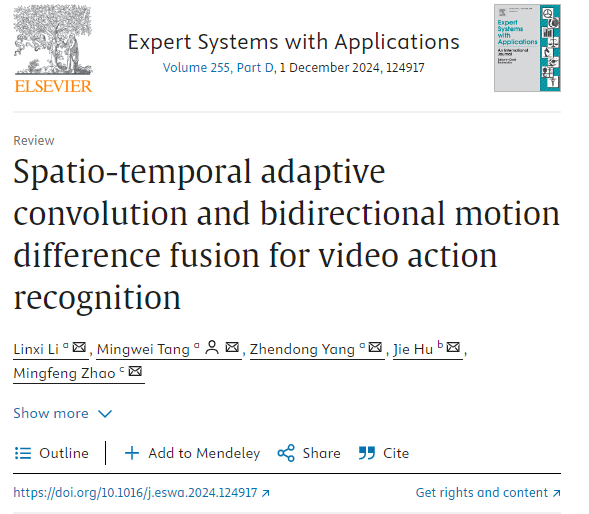 论文1Spatio-Temporal Adaptive Convolution and Bidirectional Motion Difference Fusion for Video Action Recognition发表在国际Top期刊EXPERT SYSTEMS WITH APPLICATIONS。第一作者为2023级研究生李林熹,唐明伟教授为通讯作者。