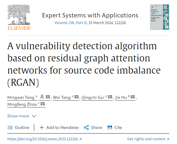 论文4A vulnerability detection algorithm based on residual graph attention networks for source code imbalance (RGAN)在国际顶级学术期刊《Expert Systems with Applications》上发表。论文第一和通讯作者为唐明伟教授,第二作者研究生唐威。