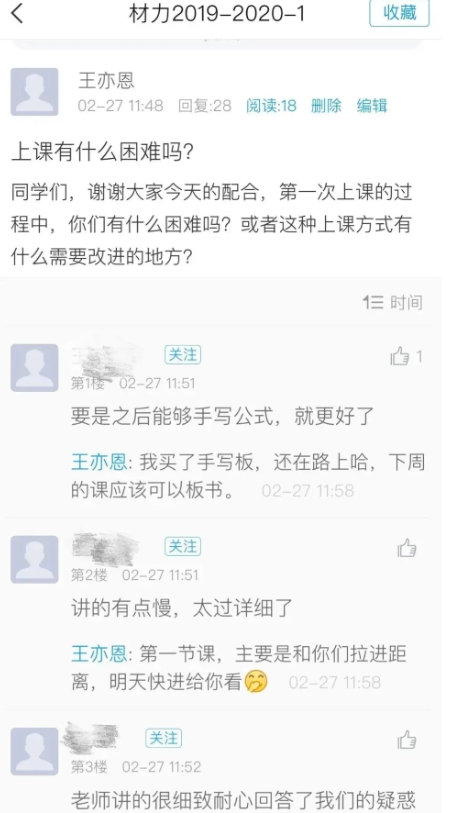 有了前面的准备,接下来就是迎接2月27日上午10点的第一次网络教学,即使在这之前做好了一切可以做的准备,但是仍然很紧张,梦里梦见的都是课堂混乱的状态。不过,27日真实的上课状态却是十分顺利的。每堂课讲课时间38分钟左右,讨论7分钟左右。学生提前告诉我,听懂了就发一个火箭,没听懂就发两个火箭,这就解决了我担心的学生掌握程度的问题。