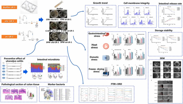LR-1被包裹在果胶钙、壳聚糖-果胶钙和海藻酸钠-果胶-乳清中,将LR-1的生物膜细胞封装在这些材料中以制备外源型微胶囊。LR-1在嵌入材料中以产生内源型微胶囊的同时形成生物膜。SPW-situ-LR-1表现出最佳的抗逆性、释放性能和储存稳定性。SPW-situ-LR-1给药显著增加了肠道中乳酸菌的存在。