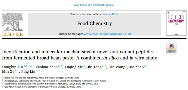 近日,我校食品与生物工程学院发酵调味品科学与工程课题组在食品领域国际Top期刊Food Chemistry发表题为“Identifying and molecular mechanisms of novel antioxidant peptides from fermented broad bean paste: A combined insilico and invitro study”的研究论文。食品与生物工程学院林洪斌副教授为第一作者。