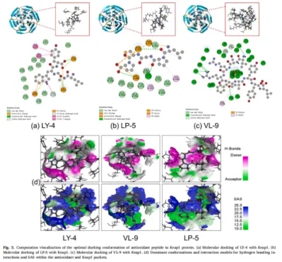 LP-5在1.0mg/mL时表现出最强的清除OH-自由基的能力,清除率为80.34±0.66%(图1i),其次是LY-4(70.41±0.65%)和VL-9(67.06±1.26%)。根据这些合成肽的构效关系(图2)和体外抗氧化能力(图1g-i),所有合成肽都具有理想的抗氧化能力。这些肽段可能是促进FBBP高抗氧化活性的活性因子之一,但其抗氧化机制和细胞保护活性尚需进一步研究证实。根据抗氧化能力测定的结果,选择LY-4、LP-5和VL-9作为代表性多肽,通过分子对接研究其抗氧化损伤的保护机制,同时进行细胞实验以评价其细胞保护作用。