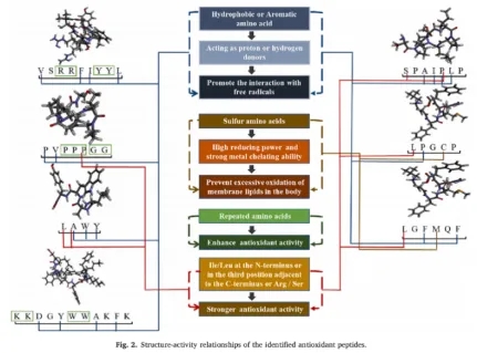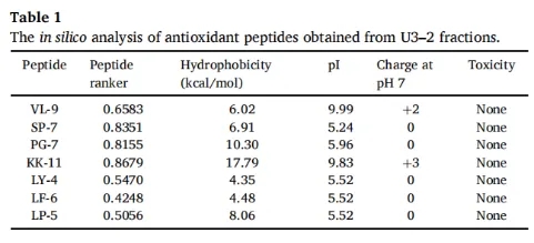 通过RP-HPLC将其分离为四个组分,各峰的抗氧化活性如图1d-f所示。U3-2对DPPH、ABTS和OH-自由基的清除能力显著高于其他3个组分(p < 0.05),在1.0mg/mL时,其清除率分别为67.03±0.27%、92.59±0.68%和69.25±2.76%。多肽的抗氧化能力还与芳香族氨基酸和含硫氨基酸的数量和位置有关,故收集了U3-2并用于随后的肽序列分析。计算机模拟方法已广泛应用于从食物衍生的蛋白质中发现新的生物活性肽,本研究采用UPLC-ESI-QTOF-MS/MS结合计算机模拟方法(包括Peptide Ranker、Toxin Pred、Pepdraw、Expasy compute pI/Mw分析和构效关系分析)对抗氧化活性最高的组分U3-2进行了鉴定。然而,目前关于抗氧化肽构效关系的研究还缺乏有效的信息。已报道含有芳香族或疏水性氨基酸的肽(Ile, Ala, Val, Phe, Asp, Tyr, Pro, Trp, Gly, Met and Leu)通过增强它们与脂质的相互作用或充当质子或氢供体来促进自由基清除活性。
