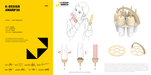 获奖作品《GEOMETRY》是一个具有功能性的包装设计,使用再生纸一体化设计,将冰棍托盘与外包装进行整合,在保证减少产品晃动的前提下实现包装功能扩展。通过对边缘折叠形成便于储存和携带的形态,并能轻松方便地用于多个独立产品的携带。运用极简设计通过识别其外观的特殊几何造型,和简约象征性图形,分辨产品类型便于销售过程的产品分类与选择。