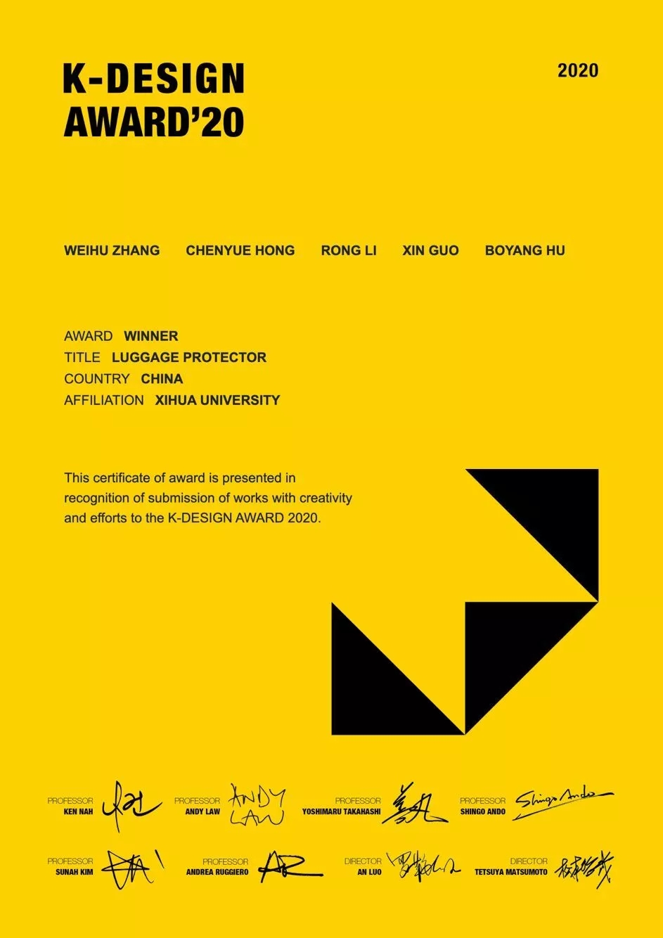 近日,世界级设计比赛、亚洲三大设计奖之一2020年韩国K-design Award国际设计奖评奖结果公布,我校文学与新闻传播学院倪泰乐老师的作品《GEOMETRY》、机械工程学院工业设计专业2017级张威虎同学创作的《LUGGAGE PROTECTOR》分别获得K-DESIGN AWARD WINNER奖项。